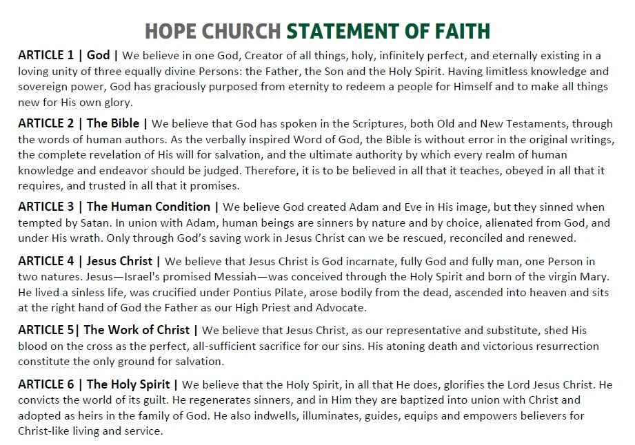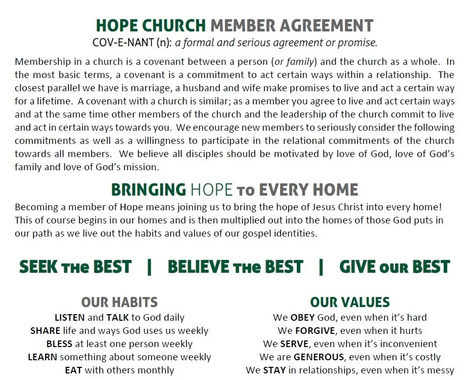 Thanks for your interest in membership at Hope! We offer our membership class to anyone interested in learning more about us. Even if you don’t end up becoming a member, we think it’s helpful to know as much as you can about us.